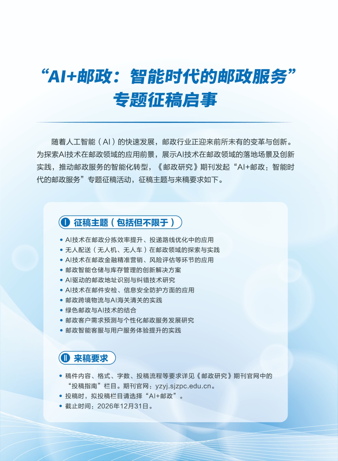 “AI+邮政:智能时代的邮政服务”专题征稿启事